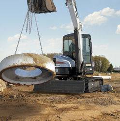 - Stabilité et capacité de levage : Avec son contrepoids et son déport arrière classique, la E55 offre un couple de rotation plus élevé pour déporter un godet plein en position tendue, ce qui lui permet de travailler efficacement sur les pentes comme sur les terrains plats.